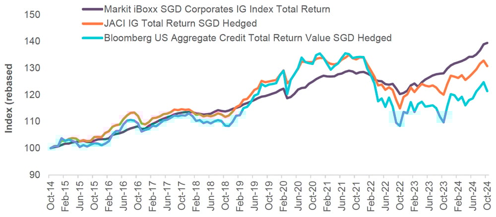 Source: Fullerton Fund Management and Bloomberg, November 2024. Past performance is not indicative of future performance. The indices used to represent SGD IG credit, Asian IG credit, and US IG credit are: Markit iBoxx SGD Corporates IG Index Total Return, JACI IG Total Return SGD Hedged, and Bloomberg US Aggregate Credit Total Return Value SGD Hedged respectively.