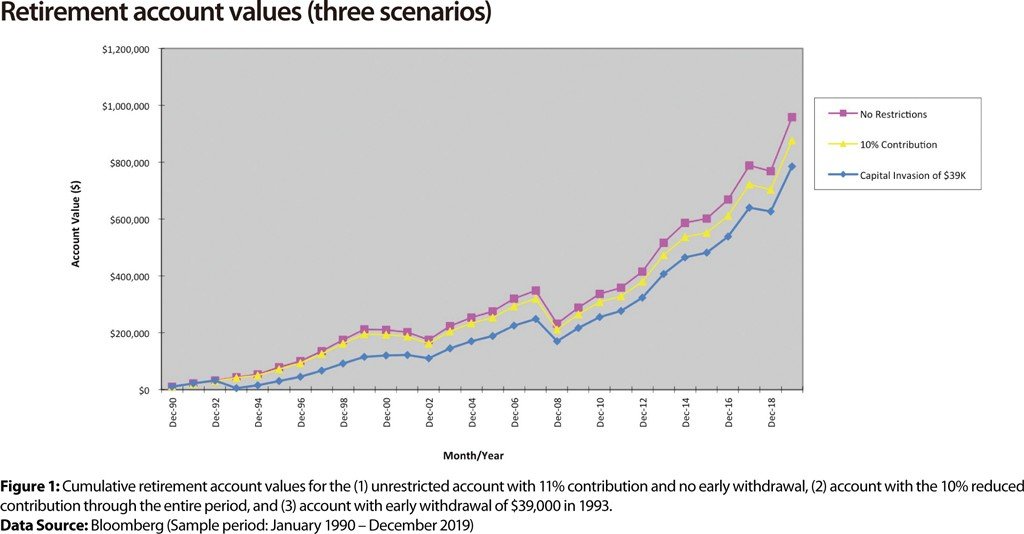 The accounts are all seeded with $10,000 initially in January 1990. As the three account values in Figure 1 illustrate, there is a reduction in terminal retirement account values in both the early withdrawal and reduced contribution cases compared to the unrestricted portfolio.